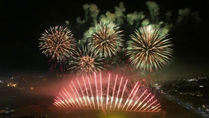 效果描述:融合了地面喷花、空中花色炸裂、鸣哨笛音以及彩色光珠等多种效果,节奏分明,高潮迭起。