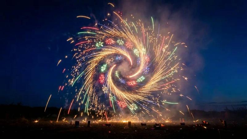 关键安全与性能参数:单个总药量≤8克。采用特殊动力结构设计,确保平稳旋转而不腾空。部分为无引线摔炮风格设计,部分配有短安全引线。